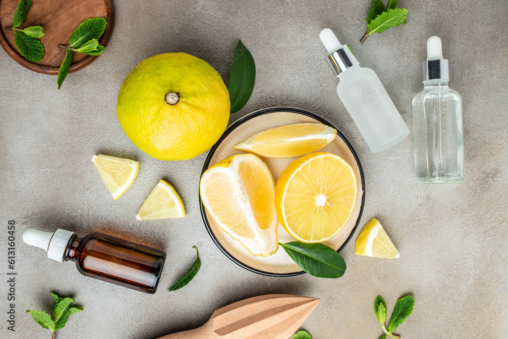 Bergamot essential oil extract and green bergamot or kaffir lime fruit with cut in half sliced and green leaf. place for text, top view