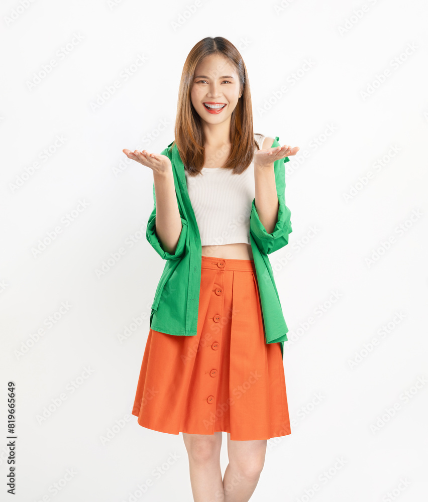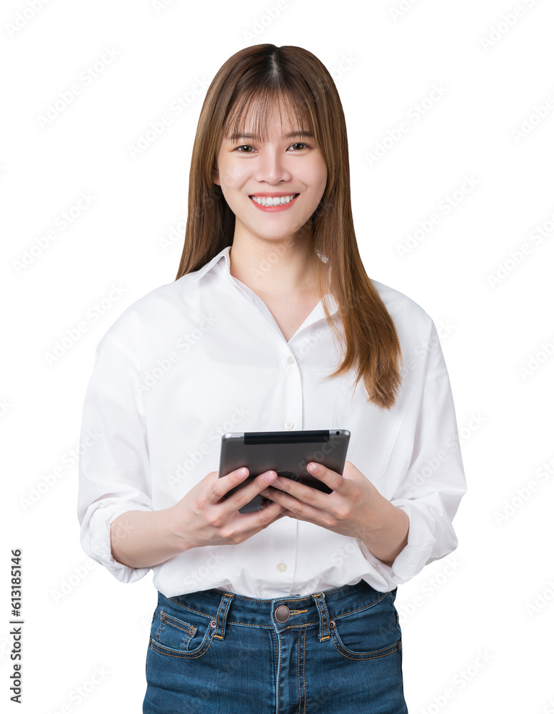 Studio shot of Beautiful Asian businesswoman holding digital tablet and smiling on background.
