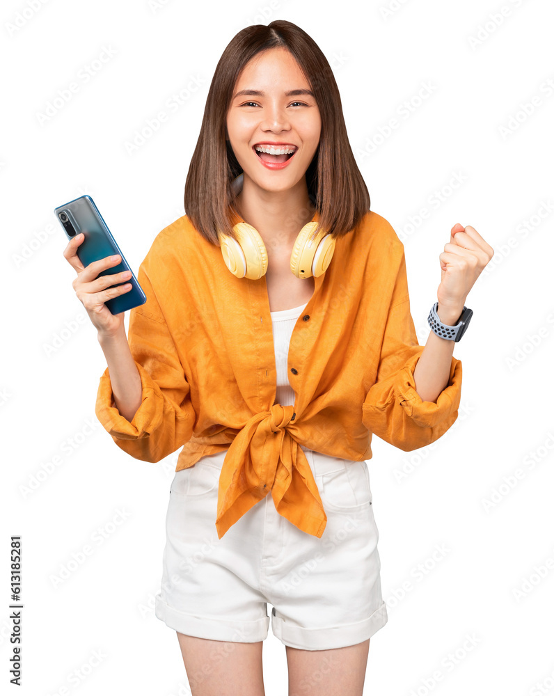 Cheerful young Asian woman in headphones and holding smartphone with fists clenched celebrating victory expressing success on background.