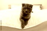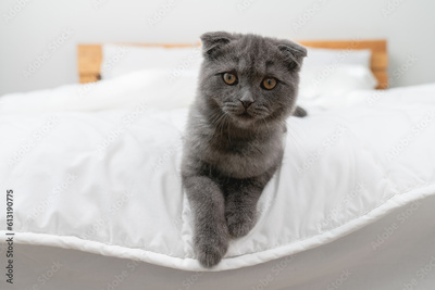 Small Scottish kitten lying down on white bed of relaxing and cozy wellbeing in home.