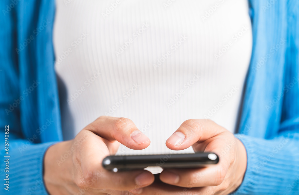 woman hand holding smartphone on white background.
