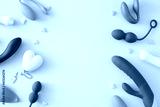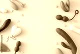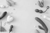 Concept of adult toys for sexual satisfaction. Top view of vibrator, vaginal balls, dildo, clitoral stimulators and hearts on pastel pink background with an empty space for text or promotional