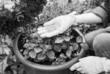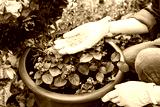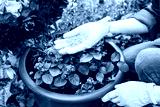 Organic fertilizers in hand of woman, who prepares to fertilize flowers in pots, person cares about flowers in home garden, fertilizing and flower care concept