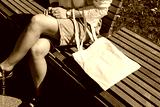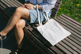 A girl sits with eco shop bag. Yound woman sitting on a bench in summer or spring park with white tote canvas cotton shopper. Zero waste, reusable, healthy lifestyle. Place for text, logo, design