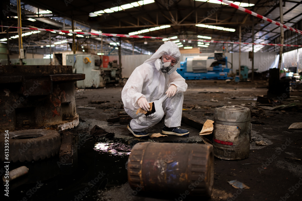 Worker or scientist industry wearing protective safety uniform, white glove and gas mask under cleaning up and lapping spilled oil in factory area to check in laboratory is industry safety concept.