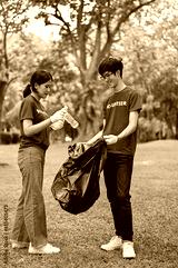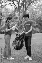 Happy Asian female and male volunteers collect trash and plastic bottles into a garbage bag