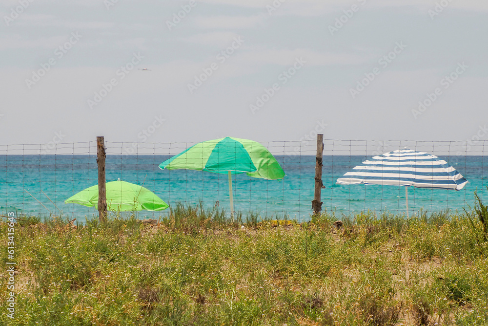 Umbrella sun on the beach of the Ruins of The Tonnara Tuna Fishery of Vendicari Natural Reserve in Sicily