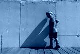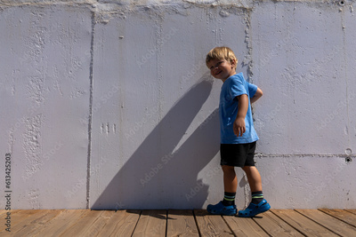 boy 3 years old blond blue t-shirt black shorts stands against the background of a white wall Fashion photography