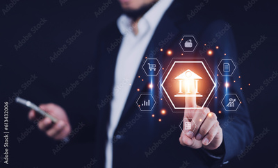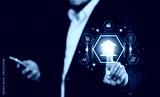 Businessman touching on digital online banking and icon network connection, online payments, shopping and digital technology business on virtual screen dark blue background.