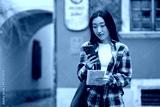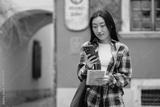 Portrait of a beautiful brunette Korean woman holding a map and comparing it with smartphone navigation on the streets of the old city. Asian tourist woman traveling in Europe.