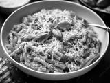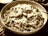 A bowl of creamy pasta with rich tomato sauce and grated Parmesan cheese.