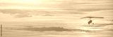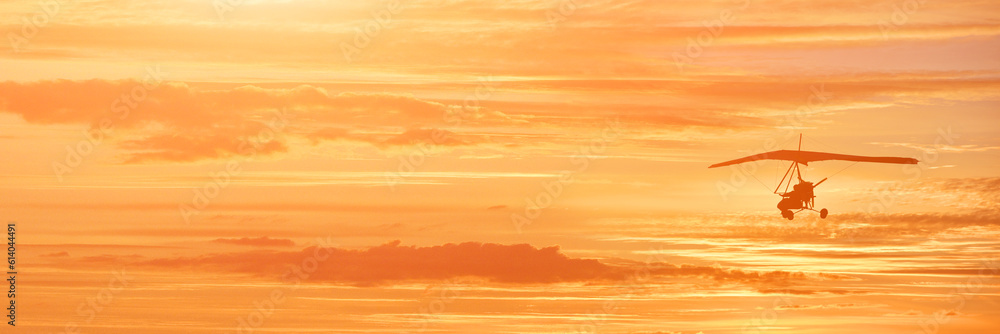 Hang glider on a motor on a summer evening against the backdrop of a sunset sky. Extreme sport. Banner, blank for an advertising layout with a place for writing