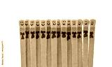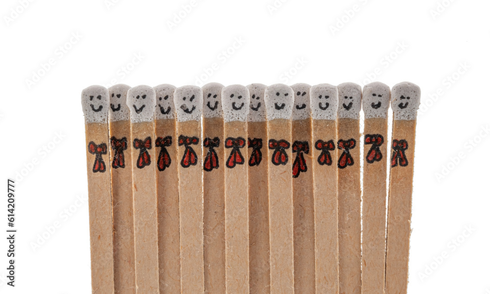 matchsticks with faces painted on the heads on white background