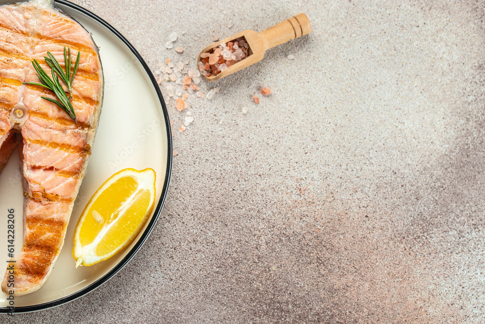Fresh cooked delicious salmon steak baked on a grill. Restaurant menu, dieting, cookbook recipe top view