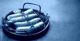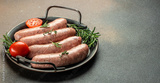 Raw sausages and ingredients on the grill pan ready to cook. Grilling food, bbq, barbecue. Long banner format. top view