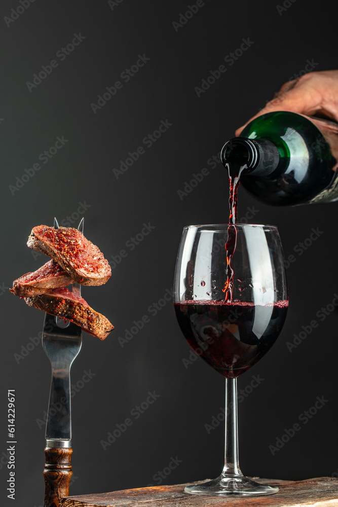 Grilled meat steak and adding seasoning, Fresh raw Prime Black Angus beef steak on a fork