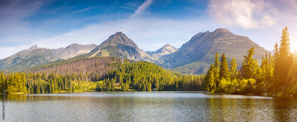 A gorgeous view of Lake Strbske pleso, surrounded by majestic mountains. National Park High Tatra, Slovakia, Europe.
