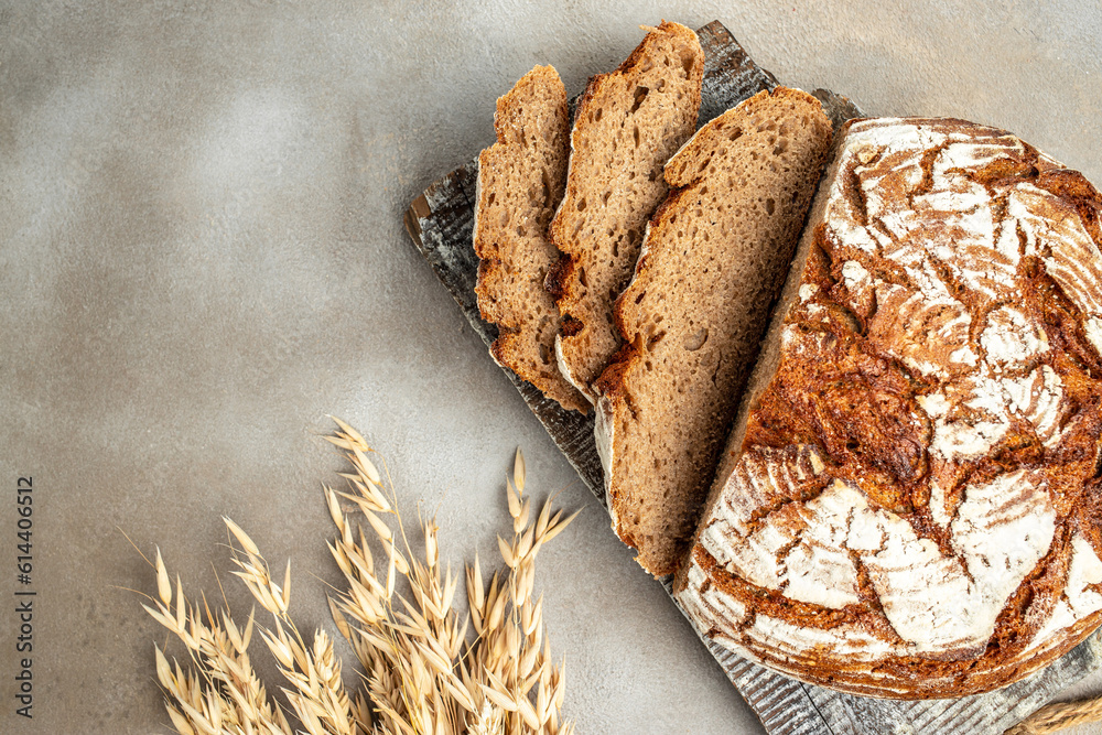 Sliced bread. Baked bread. Craft bakery on wooden board, banner, menu, recipe place for text, top view