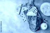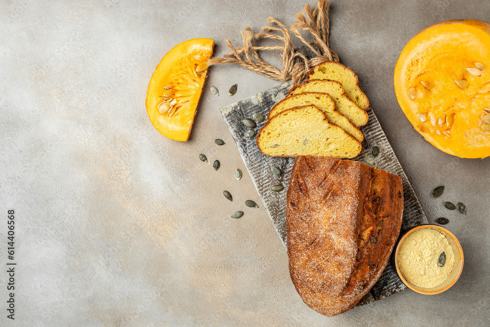 pumpkin bread on wooden board, banner, menu, recipe place for text, top view