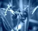 Ripe Midnight Snack Tomato, an indigo-type cherry tomatoes purplish-brown, red centers vibrant colors show healthy antioxidants anthocyanins at backyard garden in Dallas, Texas, USA