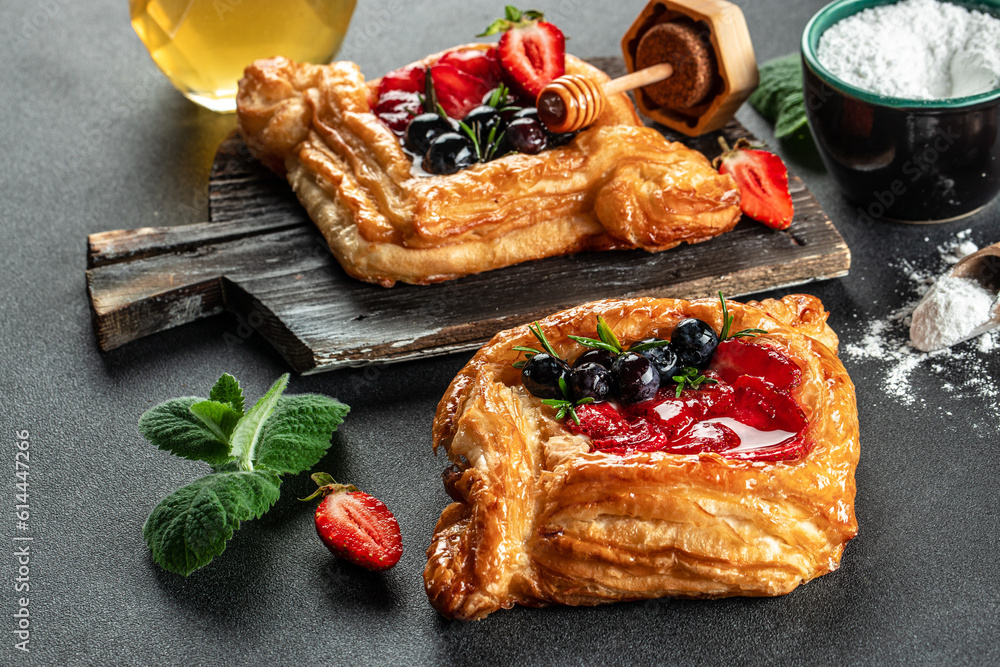 danish pastry with strawberry and honey on a dark background. banner, menu, recipe place for text, top view