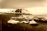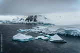 Mountain panorama of Antarctica shoreline. Amazing panoramic view. The pieces of the ice floating in the frozen ocean. Breathtaking winter landscape in the blue tints. Travel, nature, destination
