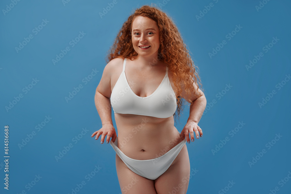 Redhead girl with freckles on a blue background