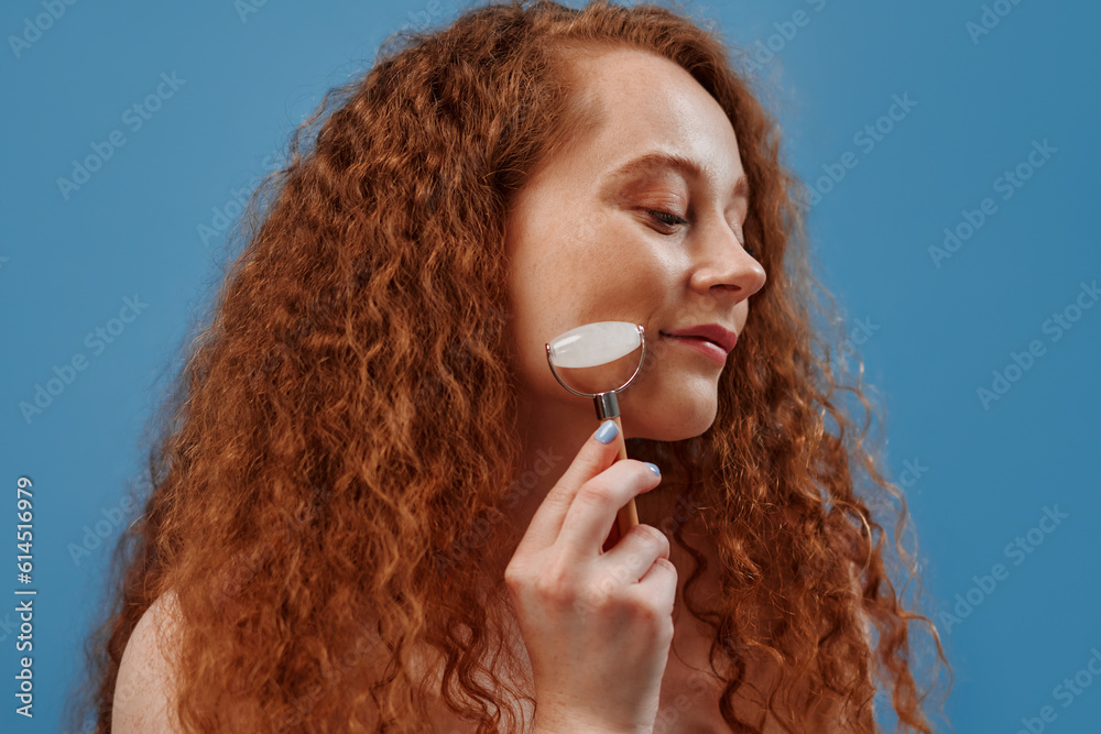 Redhead girl with freckles on a blue background