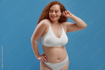 Redhead girl with freckles on a blue background
