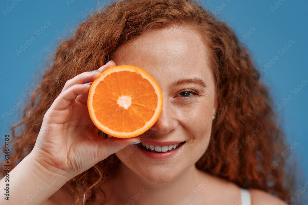 Redhead girl with freckles on a blue background