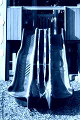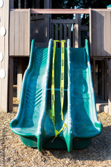 Close-up triple plastic slide with yellow caution tape under construction playground woodchips mulch area in Dallas, Texas, America