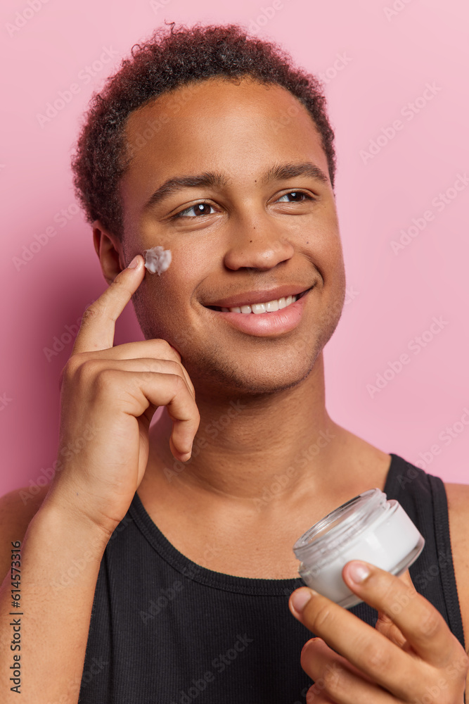 African man with short curly hair holds jar of cream applies on face for skin treatment smiles pleasantly dressed in casual black t shirt isolated over pink studio background. Beauty procedures