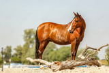 Portrait of a beautiful bay brown andalusian x arab horse gelding at the gravel beach bank of a river in summer outdoors