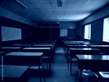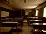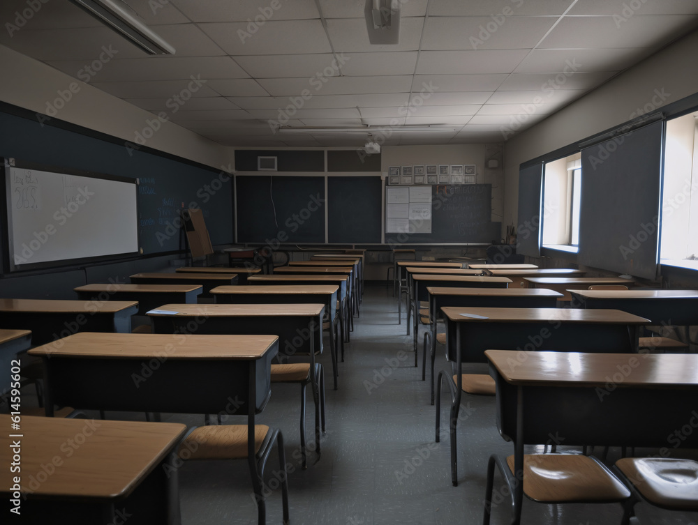 An empty classroom with neatly arranged desks and a chalkboard in the background.