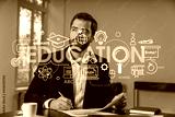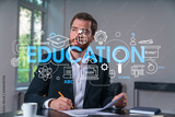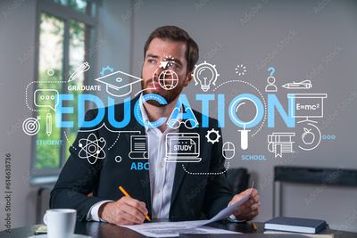 Calm businessman in formal wear signing contract at office workplace with coffee cup, laptop and notebook. Concept of successful deal, agreement, partnership, documents, lawyer. Education icons.
