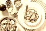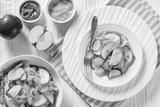 fried onion and red apple slices on white plate and in bowl on white wood table with ingredients and spices, horizontal view from above, flat lay