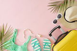 Top view flat lay of yellow suitcase, straw hat, eyewear, shell bracelet, palm leaf on light blue background with empty space for promo or text