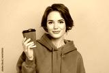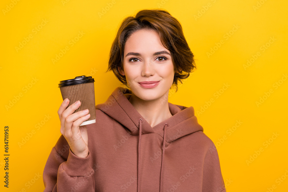 Portrait of pleasant cheerful cute girl dressed brown sportswear hold takeout cup of tasty coffee isolated on yellow color background