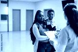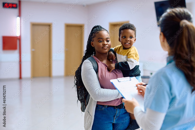 Single black mother with son talk to pediatric nurse in hallway at doctor's office.