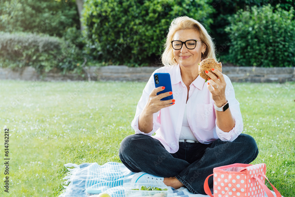 Middle aged caucasian woman sitting on green lawn, eating healthy lunch and using phone. Having picnic during break or after work. Balanced diet lunch box with salad and sanwich. Healthy eating habit.