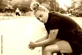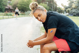 Sad frustrated lesbian woman with LGBTQ rainbow tattoo on her hand sitting on the park bench alone. Concept of loneliness, sadness and pain for homosexual discrimination. Mental crisis, depression.