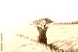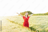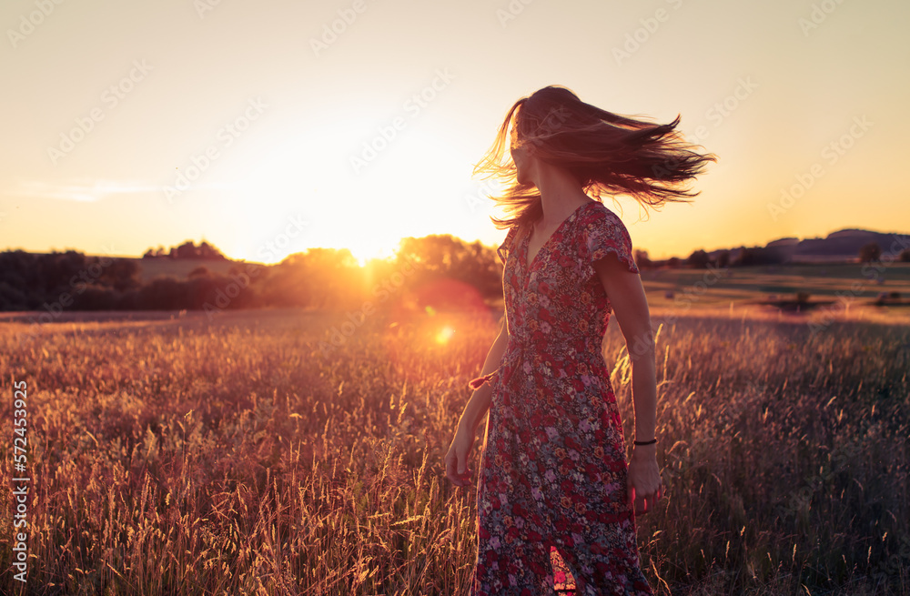 A happy young woman with raised arms relaxing in wheat field on sunset. Celebrating freedom. Positive emotions feeling life, peace of mind. Mental health practice. Nature relaxation. Selective focus.
