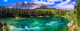 Idyllic nature scenery- turquoise mountain lake Carezza surrounded by Dolomites rocks- one of the most beautiful lakes of Alps. South Tyrol region. Italy