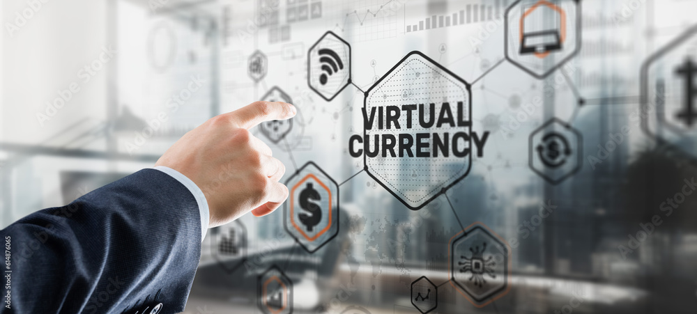 Currency symbols on a virtual screen. Virtual Currency Exchange Investment concept 2023