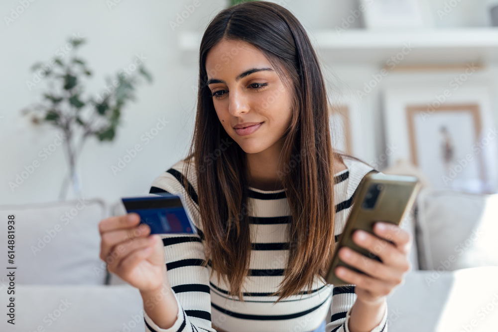 Pretty young woman shopping online with credit card and smartphone while sitting on sofa at home