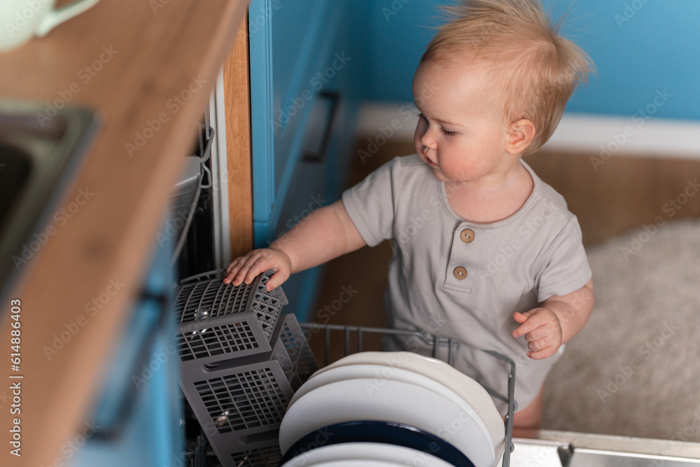 Toddler baby helps to get plates out of the dishwasher at home in the kitchen