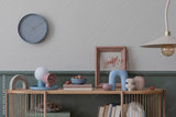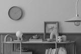 Creative composition of living room interior with mock up poster frame, wooden sideboard, vase with dried flowers, marble lamp, stylish sculpture and personal accessories. Home decor. Template.
