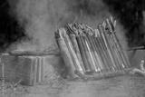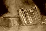 Traditional Thai dessert "Khao Lam" bamboo tube with sticky rice Sticky rice grilled in a bamboo tube burned by fire