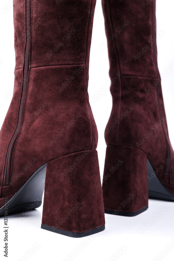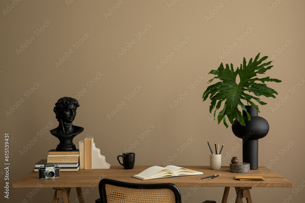 Minimalist composition of workplace interior with wooden desk, rattan chair, books, vase with leaves, pencils, camera, stylish sculpture, brown wall and personal accessories. Home decor. Template.