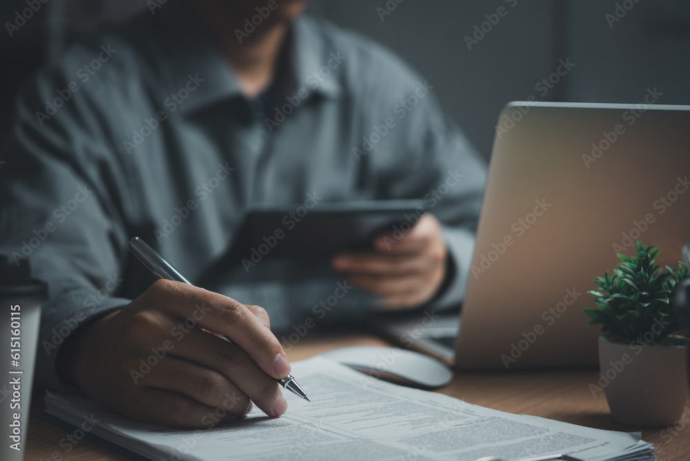 Business man holding pen with analysis financial report marketing statistic on desk.